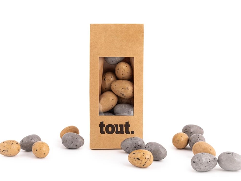 Deze heerlijke krokante eitjes zijn gevuld met een intense gezouten karamel (licht bruine eitjes) en een heerlijke diepe praliné vulling (grijze eitjes).
