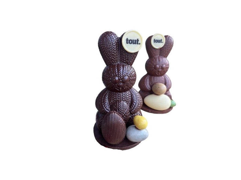 Een lief gebreid haasje gemaakt van heerlijke melk, pure of dulcey chocolade. Versierd met paaseitjes!